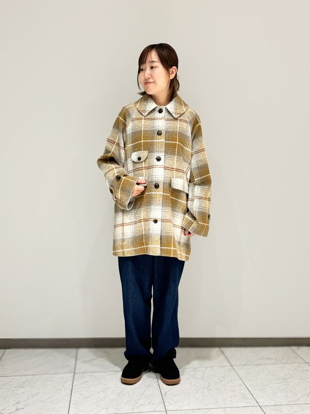 スタッフさんが提案してくれたのは、ボリューム感のあるダウンにミニスカートを合わせたヘルシーでキュートなコーデ。大柄なチェックスカートはざっくりとした温かみのある風合いがポイント。冬のスタイリングを華やかに演出してくれます。