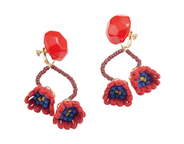 目を引く鮮やかな赤色をベースに、チラリと見えるインナーカラーがかわいいフラワーデザインのハンドメイドアクセサリー。天王寺ミオでしか手に入らないオリジナルの限定カラーです。2.5ミリ幅のエコレザーを1本ずつ繋いだ細やかなデザインは着け心地も軽やか。ハンドメイド好きの方、大ぶりのアクセサリーが好きな方へのクリスマスプレゼントにぴったりです。ピアスは揺れるパーツが付け外し可能な2Way仕様。その日の雰囲気でアレンジできます。同ブランドのヘアアクセサリーとのコーデもおすすめ。