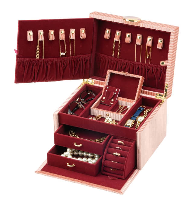 繊細なアクセサリーは、紛失や劣化を防ぐためにもジュエリーボックスに入れてまとめて収納を。アクセサリーや小物のコレクションが多い方はぜひ使ってみて。たくさんのジュエリーからお目当てを探す時も、ジュエリーボックスに収納していればすぐに選べるので毎日のおでかけ準備もスムーズ。
