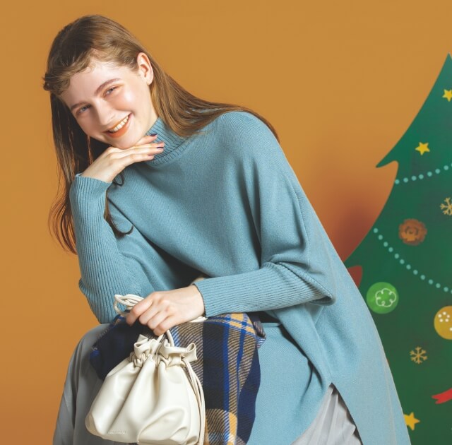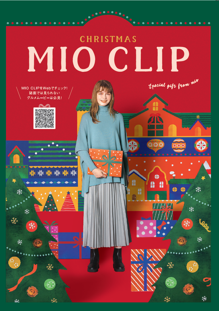 天王寺ミオで展開中の情報誌「MIO CLIP CHRISTMAS」の表紙にもコムサスタイルのコーデが採用されています。こちらの写真のようにニットとロングスカートを組み合わせるのが今年らしい着こなし。ワイドパンツとの組み合わせもおすすめです。ファーやデニムなど異素材アイテムを加えるのも◎。