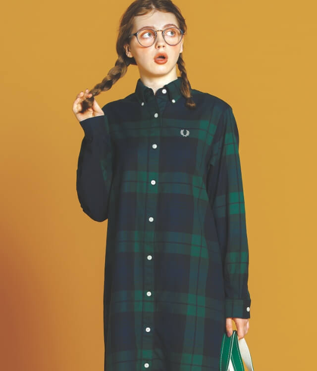 人気のブランド「フレッドペリー」から、オリジナルのタータン柄がクラシカルなボタンダウンのシャツドレス。袖のエルボータックと前後で印象が変わる切り替えがポイント。フロントは滑らかな風合いの先染めタータンのツイル地、後ろは高密度ツイルを使用しています。ワンピースとして楽に着られ、これだけで可愛くきまるのでクリスマスプレゼントにもおすすめ。1枚で気分を上げてくれるとっておきのアイテムです。カジュアルスタイルにもきれいめスタイルにも似合うデザイン。アウターと重ねて裾からワンピースが見える着こなしもおすすめ。首もとにレースなどをレイヤードするとより女性らしい雰囲気になりますよ。自分へのご褒美ギフトにもぴったりです。