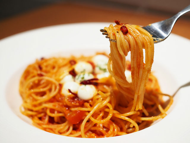 スパイシーカルボナーラと並ぶ人気メニュー!完熟トマトの旨味とモッツァレラチーズのコク、スパイシーなソースが食欲をそそります。