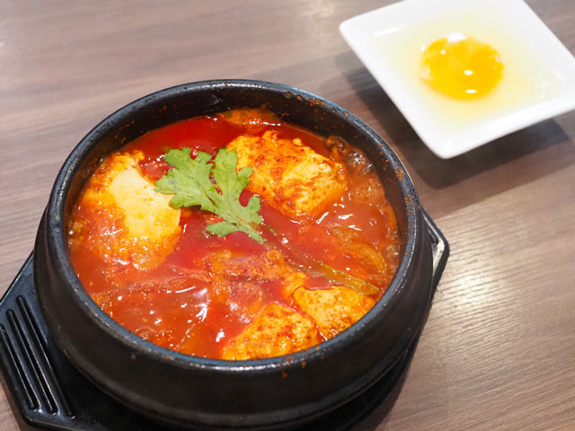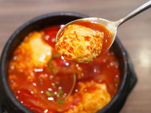 石焼ビビンパとスンドゥブが自慢の韓国家庭料理店「韓国料理 ビビム」。牛骨スープで煮込んだスンドゥブはコク深い味わいがクセになる一品です。辛さは0〜5辛(5辛は+110円)まであり、その日の気分に合わせて選べるのが魅力。(※写真は3辛)