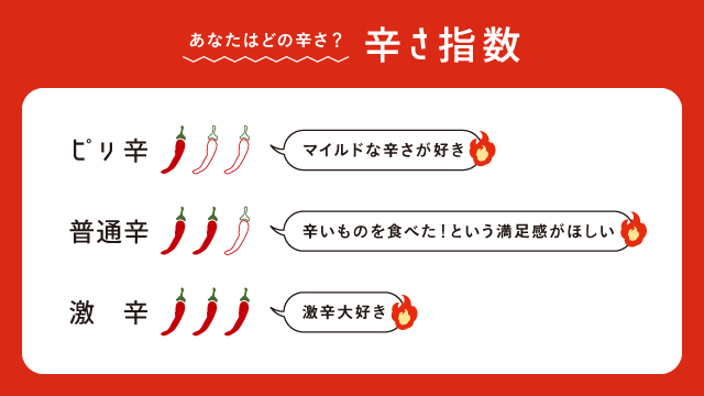今回は各メニューに辛さ指数をつけてご紹介。マイルドな辛さが好きなら「ピリ辛」、辛いものを食べた!という満足感がほしいなら「普通辛」、激辛大好きな方は「激辛」をチェック!気分に合わせてお気に入りのスパイシーを探してください♪
