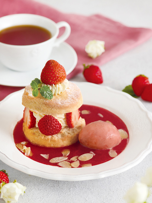 「アフタヌーンティー・ティールーム」で、苺の香りに包まれるティータイムを。さっくりふわっと食感のスコーンにフレッシュ苺とレモンミルクホイップをサンドし、苺ソースやジェラートで華やかさを添えました。パートナーや友人、自分へのご褒美にも◎。