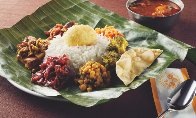 スリランカカレーをルーツに完成させた本格スパイスカレーのポンガラカレーから、バナナの葉で包まれた天王寺ミオ限定のスペシャルなスリランカプレートをご紹介。旬の野菜で作った6種類の副菜とライスを、バナナの葉で包んで蒸しあげた香り高い1品です。