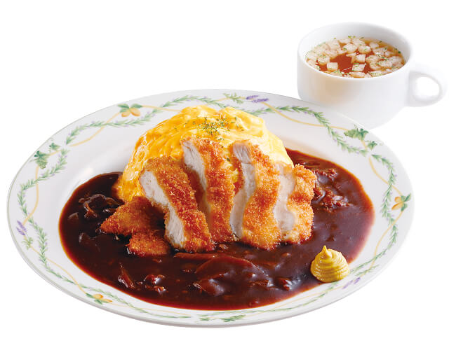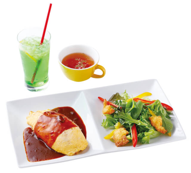 ポムの樹自慢の定番オムライスと、店内で仕込んだシュリンプフライが入ったサラダがセットになった人気メニューが復活。リクエストが多いコンソメスープとドリンクまで付いた欲張りセットは、天王寺ミオでしか味わえません。他にも満腹セットとして、ハーフサイズのパスタとオムライスが一度に楽しめるコンビメニューもおすすめです。