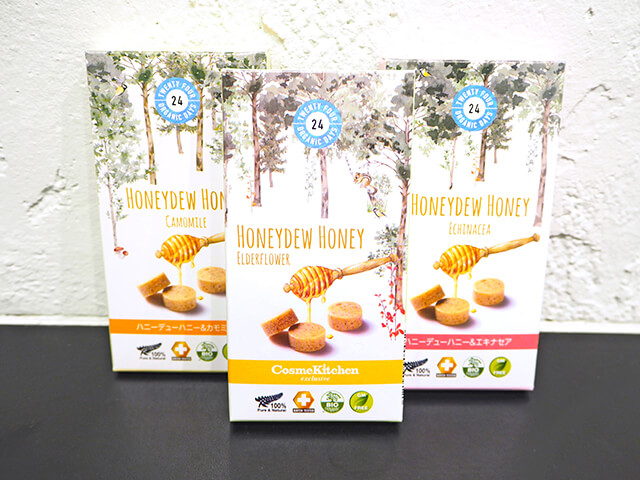 「ハニーデューハニー」のベースは、ブナの木に棲む昆虫やミツバチの働きで熟成された蜂蜜。花の蜜からできた通常の蜂蜜よりもオリゴ糖やミネラルが豊富といわれています。コスメキッチンでは各種ハーブを加えた3種類の飴を販売中。コスメキッチン限定のエルダーフラワーは、ふんわり甘く香るやさしい味わい。りんごのような香りのカモミールはリフレッシュタイムにぴったりです。季節の変わり目におすすめのエキナセアは、お出かけのお供としてバッグに常備を。どのフレーバーもさっぱりとした味わいで、タブレットタイプなので手軽に食べられます。