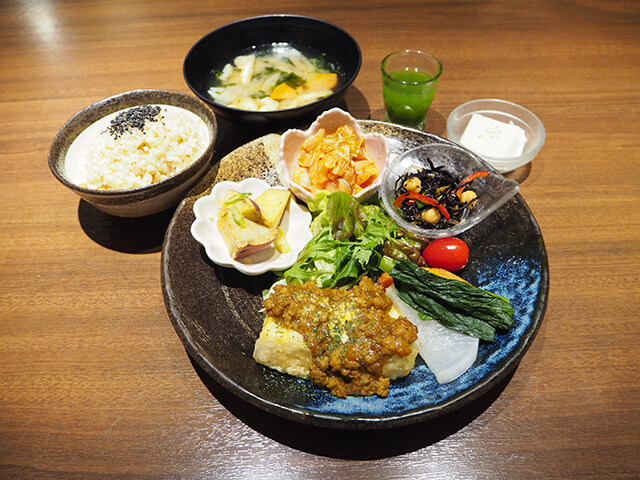 旬の野菜を中心に39品目以上の食材を使用した日替わり定食をご紹介。約600kcalになるように組まれた献立は満足感も十分。男性・女性問わず、カロリーが気になる人にもおすすめです。11:00~18:00の間はデザートのミニ豆乳プリン付き。玄三庵は「本日もみなさまが健康でありますように」との思いで、管理栄養士が監修したメニューを提供。有機栽培・減農薬栽培で育てられた島根県産の玄米や産地直送の野菜を使用しています。