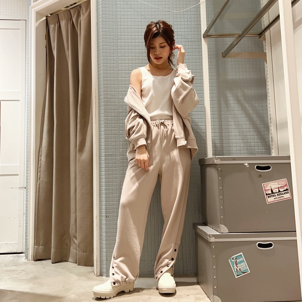「少し個性的なアイテムを選ぶといいかも。今回コーデしたスエットは、まずこのライトグレーのカラーが大人っぽくてすごくかわいいですよね!パーカーの着丈が短めなのでスタイルアップも叶うし、そのまま着ても綺麗見えすると思います。あと、パンツの裾のボタンスリットが可愛いすぎるっ♡ボリュームのあるハイカットスニーカーを合わせて、スリットからチラ見せさせればバランス抜群です!」
