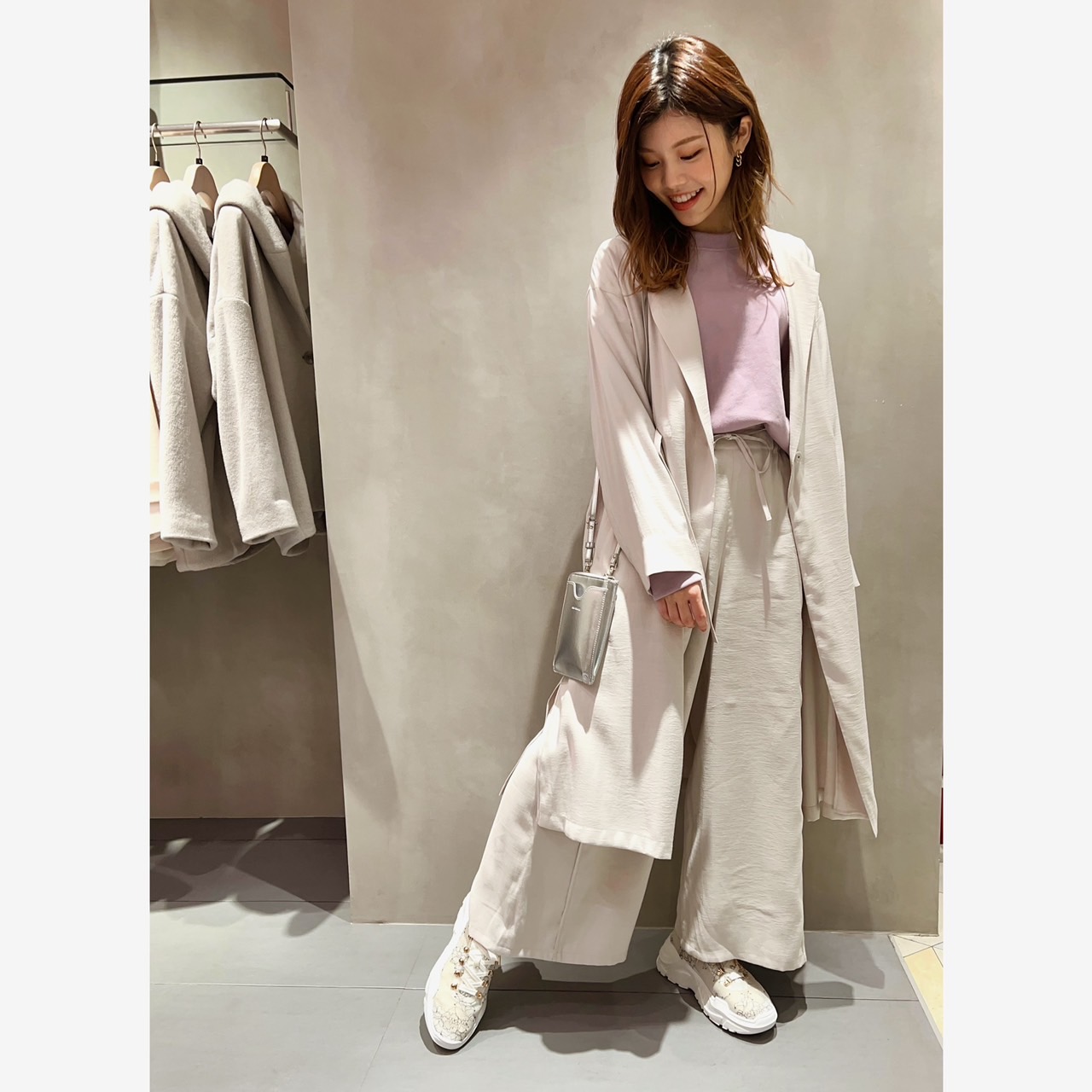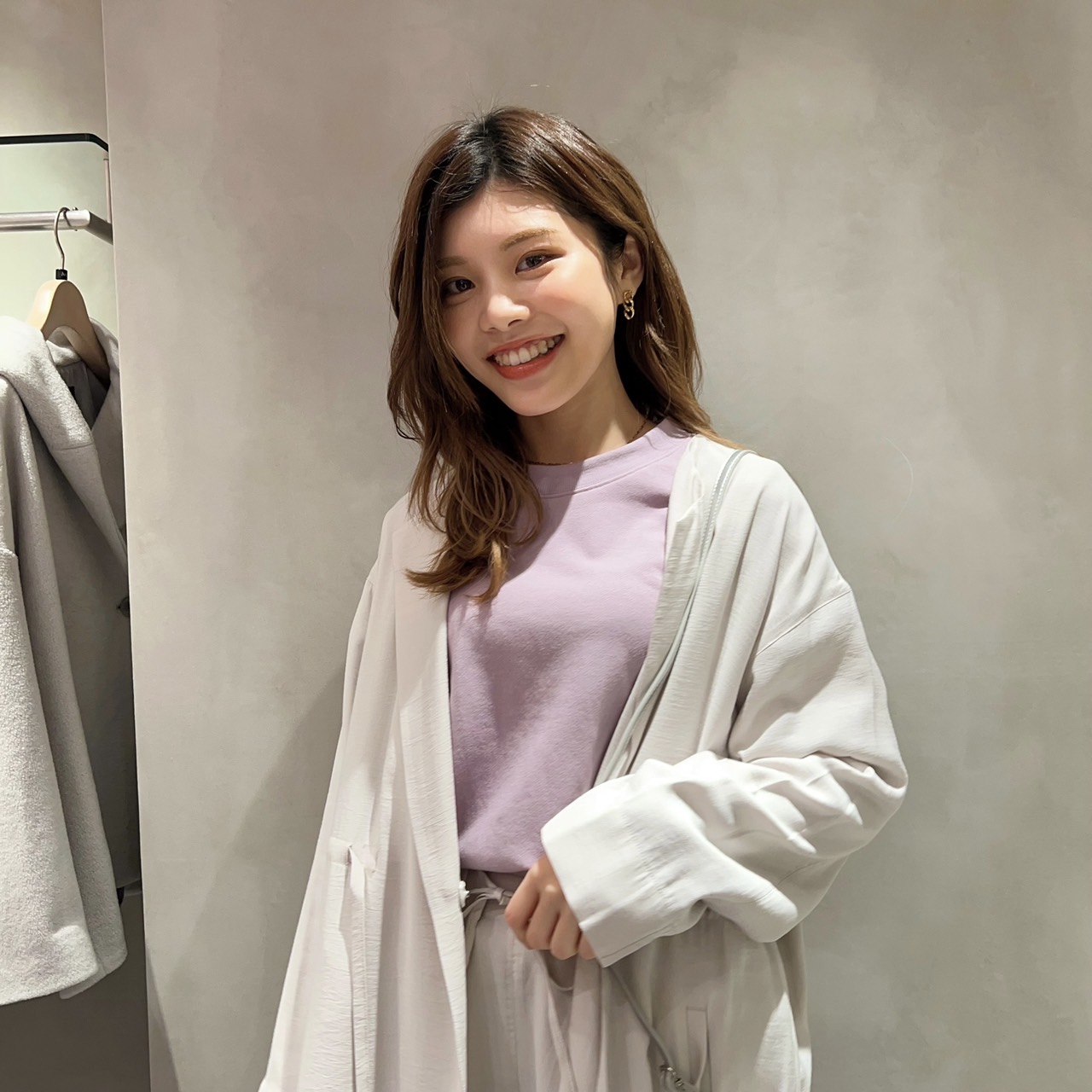 「セットアップアイテムが淡いベージュで上品な印象だったので、すんなり馴染んでくれる同トーンのカラーをインナーに選びました!ベージュやホワイトなど合わせやすい色をベースに、どこか差し色を入れるのが私流。このラベンダーカラーのプルオーバーも、すっごくいい色ですよね!