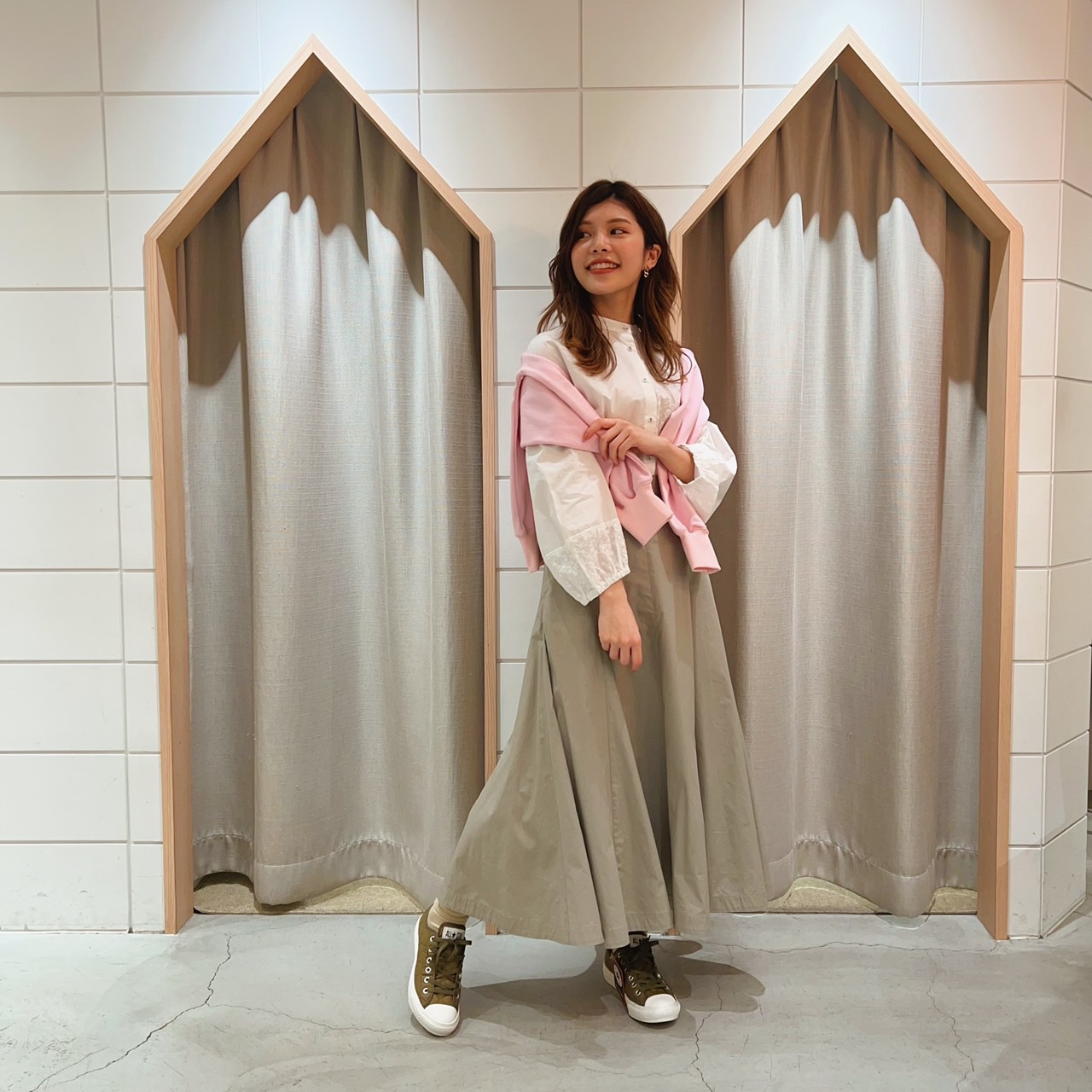 足元はエース シューズでセレクトした、コンバースのキルティングスニーカーを合わせました。スカートの色とのバランスもばっちりです♪」
