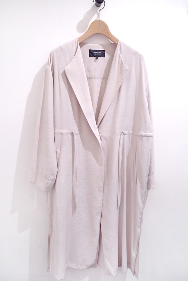 さらっと着てもおしゃれに決まるノーカラーコート。ウエストのドローストリングがアクセントになり、絞ればシルエットに変化が生まれます。裾スリット入りで歩きやすく、動くたびにふわっと揺れるのも魅力。