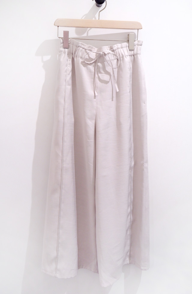 なめらかなドレープが上品なワイドパンツ。センターに入ったパイピングが足全体をすらりと見せてくれます。ウエストがゴム仕様なので履き心地抜群!