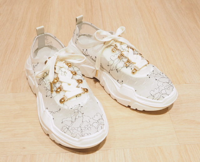 足元はランダのスニーカーで。レーシーな素材感やゴールドのアクセントがかわいいのはもちろん、すっごく軽くて歩きやすのもうれしいです。
