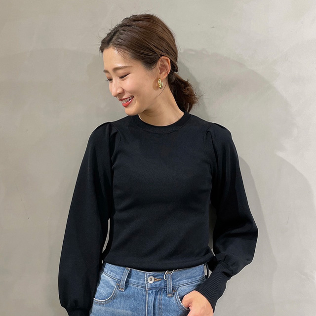 「ニットはパワーショルダー仕様になっていて、1枚でさらっと着てもかわいいんです♡黒は、コーデに取り入れるとぐっと締まって見えるのでおすすめ。黒のデザインニットを1枚持っておけば、これから春にかけていろんなシーンで活躍してくれそうです!」