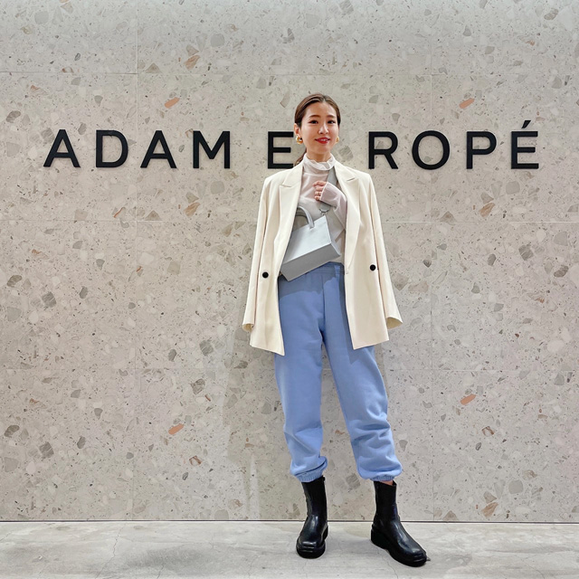最初にご紹介するのは、トレンドを押さえながら自分らしさも忘れない「アダム エ ロペ」。スタッフさんおすすめの中からHIRONさんが選んだのがこちらです。お気に入りポイントは「なんといっても空色のスウェットパンツ!」とHIRONさん。着てみていかがですか??