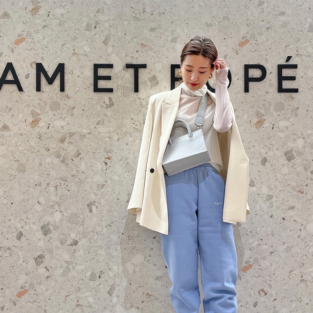 「パンツスタイルが好きなので、トレンドのスウェットパンツも気になっていて。履いてみるとシルエットがキレイで思った以上にすてきでした♡きれいめアイテムを少しカジュアルダウンして着るのが好きなので、ジャケットにスウェットパンツを合わせるバランスも大好きです。