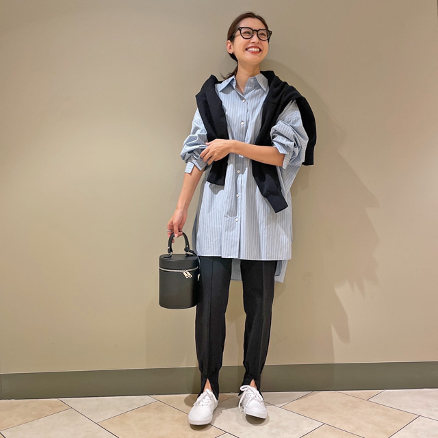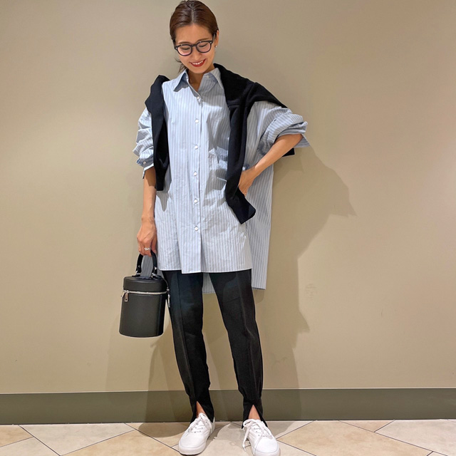 「普段の私に近いコーデです。ビッグシルエットのストライプシャツは、すとんと落ちて腰まわりをほどよく隠してくれるので安心感抜群。袖をラフにまくって肌見せすれば、違和感なく馴染んでくれると思います!