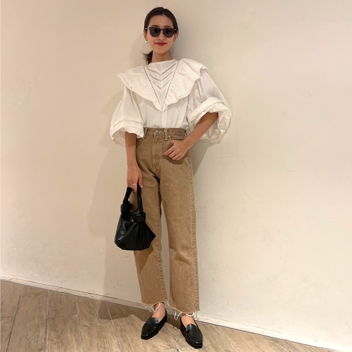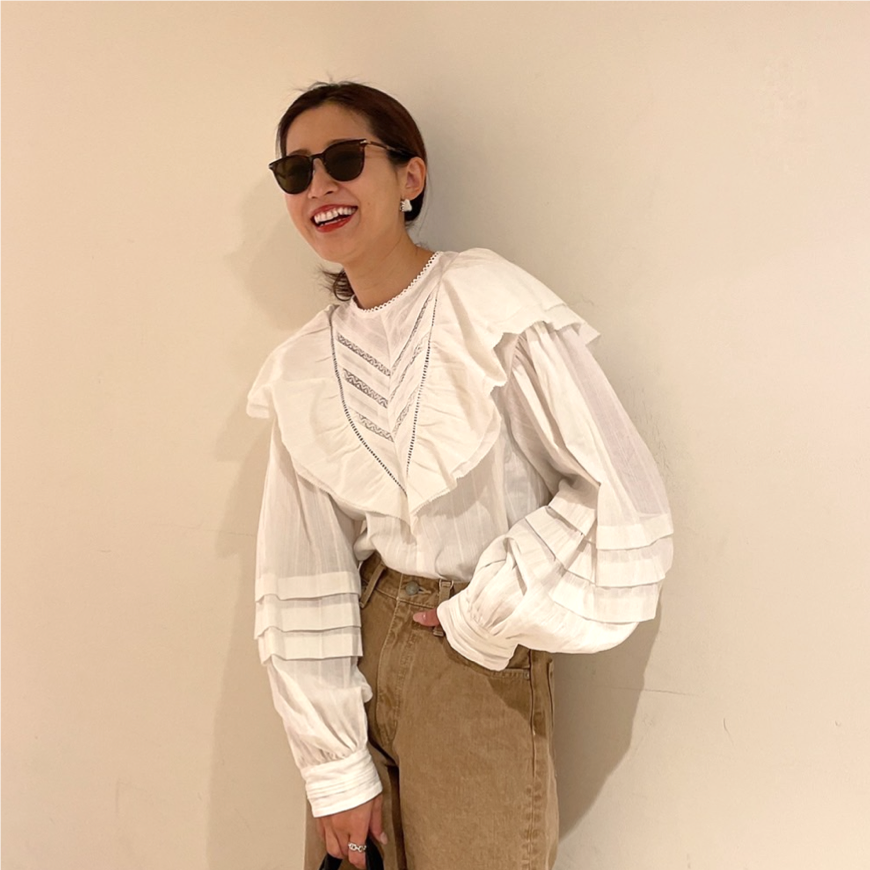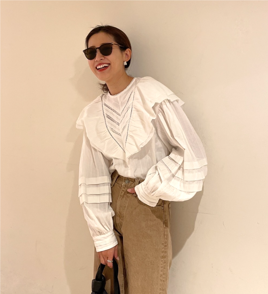 カットオフでこなれ感たっぷりのベージュデニムに、ボリュームスリーブやフリル使いのブラウスがとっても印象的。HIRONさん、着てみた印象はいかが??