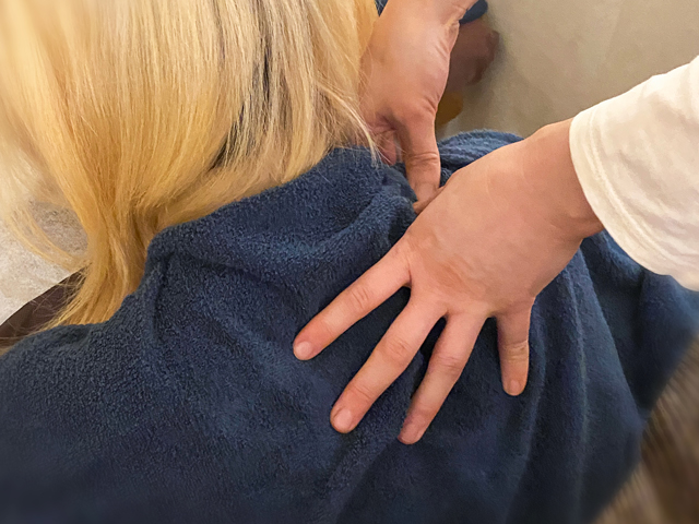 ヘッドコースでは頭~首周りをマッサージ。頭のてっぺんをぐぐっと押したり、生え際やこめかみを指圧したりと優しく心地よい強さで揉んでもらって思わず笑顔に。PC作業で目が疲れている方、眠りが浅い方はぜひお試しを。
