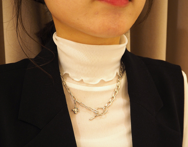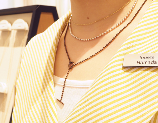 「エテは華奢なアイテムが多いのですが、この春は存在感のあるジュエリーも多く出ています。」とスタッフさん。とくに、チェーンネックレスにチャームをプラスしたアレンジがおすすめとのこと。