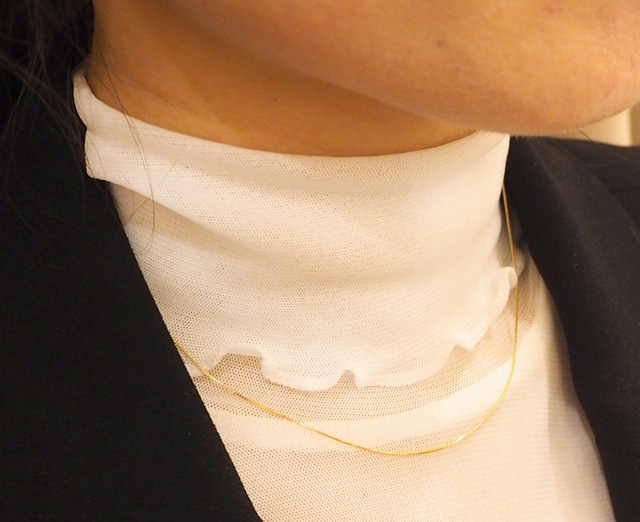 「ほどよい長さなのでシャツと合わせてもすてきですし、薄手のシアータートルの上から重ねたり白のロンTと合わせたりすると、キャッチーでおしゃれです!」とスタッフさん。たしかに、シンプルに決めたい日のポイントになってくれそうです。