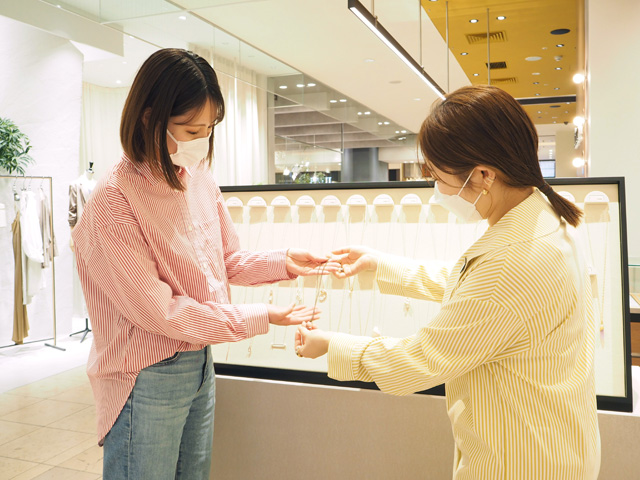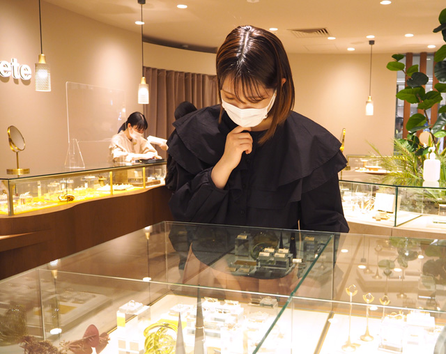 広々とした空間でゆったりとジュエリーが選べるので、お買い物時間も豊かに♪一つひとつのジュエリーも見やすく、編集部員も興味津々でショーケースを覗き見していました。