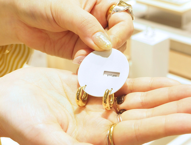 「ライナーカフでボリュームのある耳元を演出したら、首周りはシンプルなネックレスにしてバランスを取るとすてきに決まります。」とスタッフさん。ジュエリーを合わせるバランスって難しい…という方も、ショップスタッフさんが丁寧にアドバイスしてくれるので安心。ジュエリーのプロにスタイリングのポイントを教えてもらいながら、パッと目を引く洗練スタイルを叶えましょう!