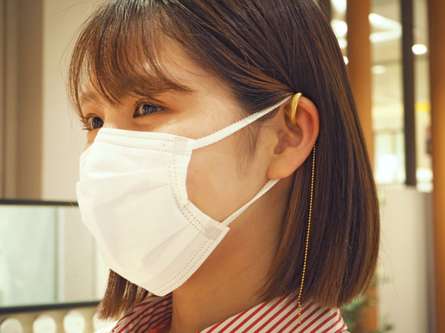 普段からジュエッテのアクセサリーを愛用している編集部員。こちらの「メッシュカフス」がとっても気になりました!ぷっくりとしたゴールドのカフスは、マスクをしていても存在感をしっかり発揮。ボールチェーンが髪に馴染んでかわいいです。何より、耳をやさしくホールドしてくれるので、マスクを付け外しする際にも取れにくいのがGOOD!