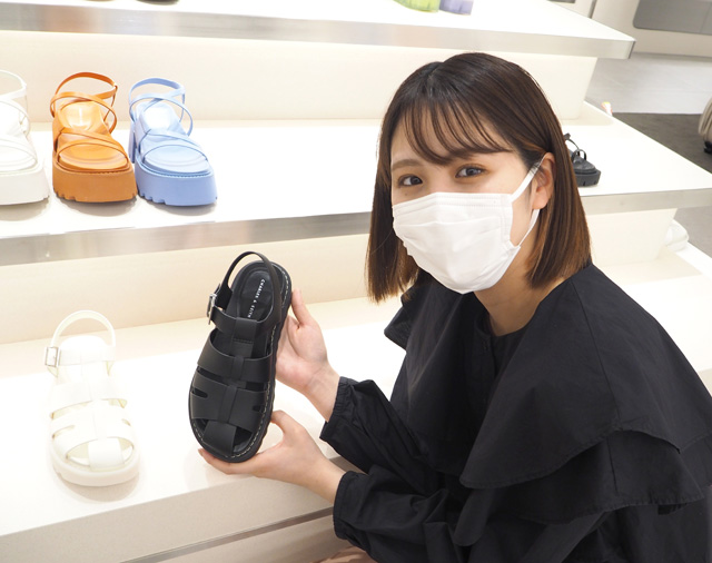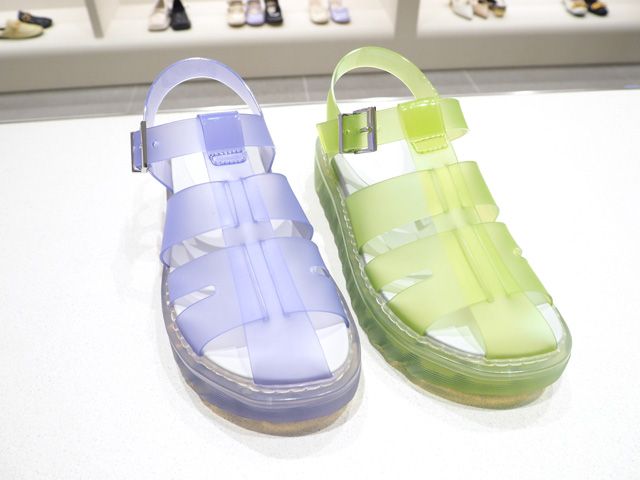 春のイチオシは、引き続きトレンドの厚底サンダル。爽やかなスケルトンカラーなら足元にほどよい印象を与えてくれます。「そのまま履いていただくのはもちろん、ソックスと合わせていただいてもすてきですよ!」とスタッフさん。ソックス合わせでも履けるなら、春先から夏本番まで長く使えて嬉しいですね。