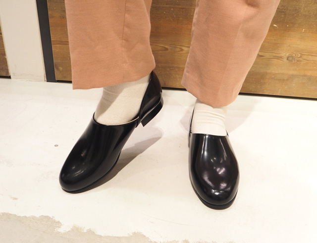 「履き始めはかっちりとした印象で、馴染んでくるとこなれ感が出てまた違った雰囲気が楽しめます。艶感のあるタイプとマットなスムースタイプの2パターンあるので、ぜひ試し履きして見比べてみてくださいね。」とスタッフさんもにっこり。