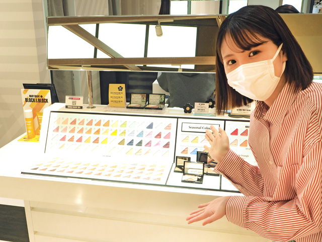 「しっとりとした質感でまぶたにもぴたっとフィットするのが特徴です。時間が経ってもくすみにくく、つけたての発色がキープできますよ。」とスタッフさん。