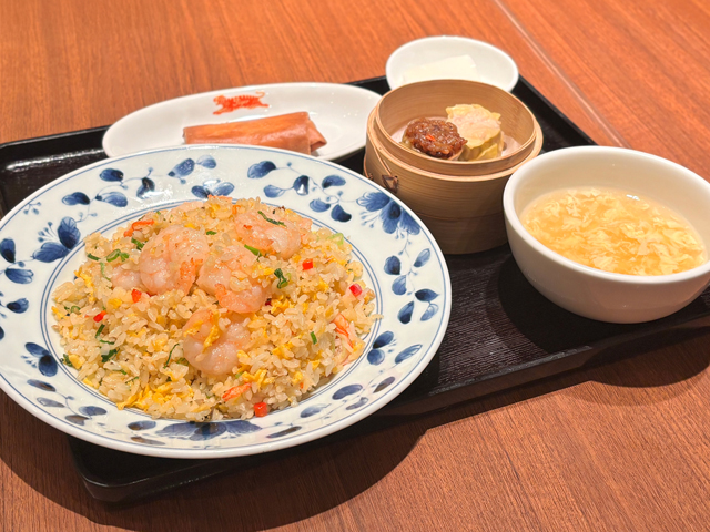 ラーメンのほかにも、鉄鍋棒餃子や担々麺など個性ある中華料理が揃うのも「紅虎軒」の魅力。こちらのセットはぷりぷりのエビがはじけるエビカニ炒飯に、もち米焼売、サクサクの五目春巻き、口どけなめらかな杏仁豆腐がついて大満足間違いなしです。