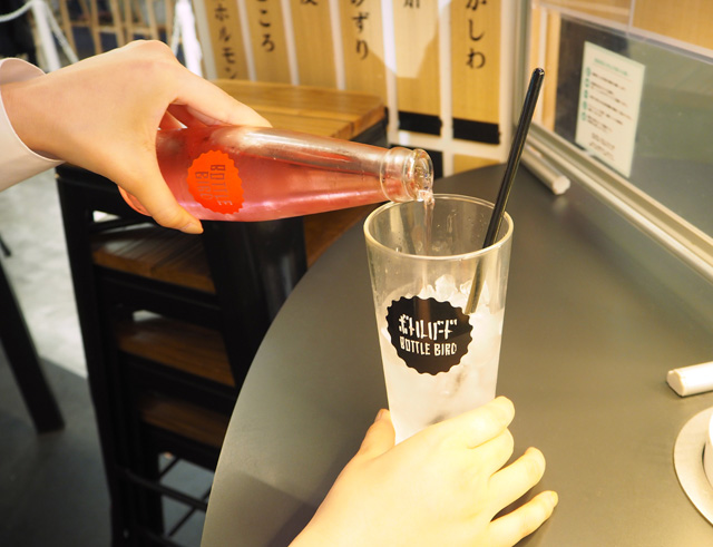 「焼鳥 ボトルバード」は“焼鳥×バー”がコンセプトのおしゃれな店内で、おひとり様でも入りやすい雰囲気です。グラスに注がれたお酒を炭酸水やジュースで自分で割るスタイルなので、濃さをお好みで調整できます♪