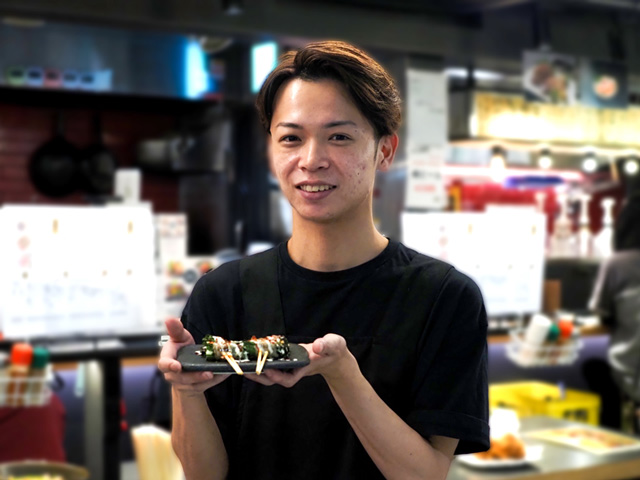 こちらはスタッフさんもおすすめの「はみ出すトロたく巻」。名前の通り、海苔からはみ出るほどたっぷりの中トロとたくあんを巻いたお寿司です。