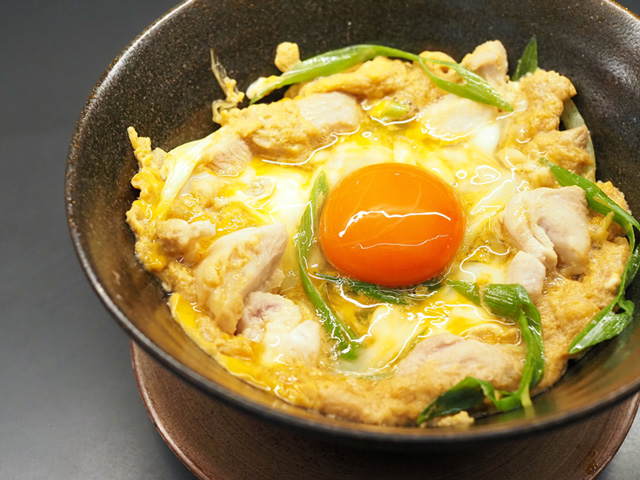 ランチでも人気の「親子丼」は、大分県のブランド玉子「蘭王」を使用。オレンジ色に輝く卵黄が食欲をそそります。半熟に仕上げた濃厚な玉子と鶏肉の組み合わせは絶品!
