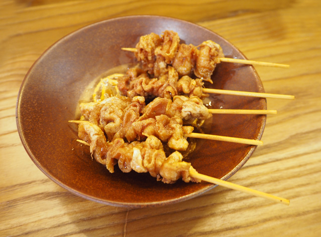 人気メニューはまだまだたくさん。「皮パリ串」は国産鶏皮をパリッと揚げた一品。秘伝のタレとスパイスを絡めた甘辛味で、意外とあっさりしているから何本でもいけちゃいます。小ぶりな串であっという間にぺろりです♪