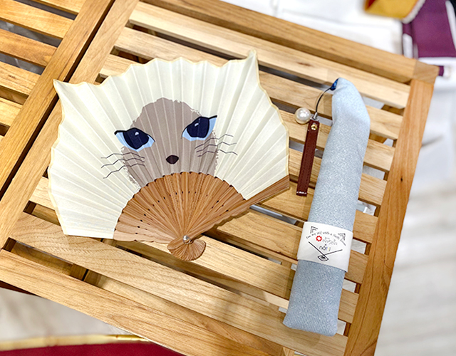 ねこの顔のかたちの扇子はインパクト抜群。ふりふ別注で顔の表情や色にこだわった扇子はインパクトがありながらプチプライスなので夏のギフトにも最適です。持ち運びに便利な収納袋はキラキラとしたラメ生地なので夏らしさも◎耳部分まですっぽりと入るサイズなので、耳が折れずに収納できるのがポイント。猫の首輪を思わせるストラップにはパールがついており、細部まで可愛いポイントが詰まったアイテムです。