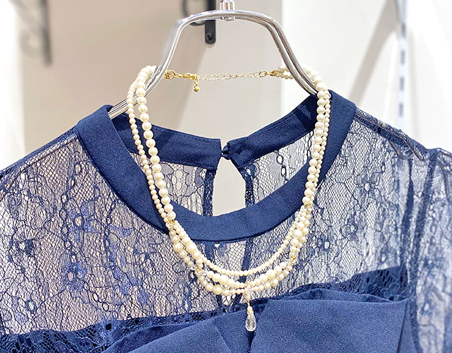 普通のネックレスとは違ったプリンセスラインが、ドレスならではのロイヤルなイメージに。クリスタルが透明感をアップしてくれるので顔色が良く見え、ドレスコーデのワンポイントにも◎