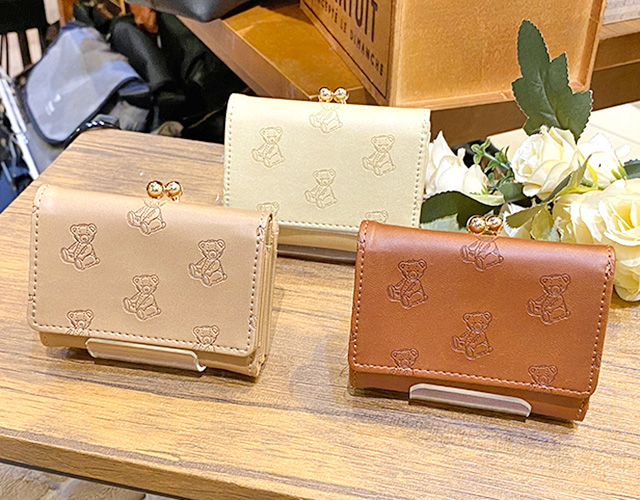 くま柄が可愛い三つ折りのコンパクトなミニ財布。手触りが良く、肌馴染みの良い素材がポイント。がま口部分は口が広がるので小銭を取り出しやく使いやすいアイテムです。