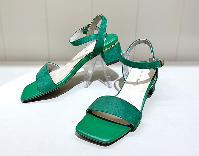 シンプルなワンベルトデザインと、程よい高さのミドルヒールがデイリー使いにぴったり。トレンドを取り入れたワイド幅のスクエアトゥや、ヒールに入れたゴールドのメタリックラインが高見えする1足。今季注目のビビットカラーも足に馴染むスエード素材を使用してコーデに取り入れやすいアイテムに。