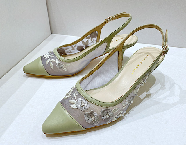 昨年大好評だったフラワー刺繍パンプスが今年も登場!トレンドの透け感が女性らしいチュール素材に、春夏気分をロマンティックに盛り上げるオリジナルのフラワー刺繍をプラス。今年は刺繍にビーズが付いたデザインで華やかさがアップしました♪抜け感のあるバックストラップやチュール素材で、軽やかな大人の足元を演出します。