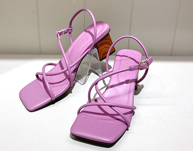 アシンメトリーの華奢なチューブストラップデザインとウッドヒールが特徴の1足。アッパーと中敷を同色でまとめて統一感を出し、広めのスクエアトゥにすることで大人っぽい印象に。ヒールは踵よりも小さめの形状にすることですっきりとしたシルエットになり、色んなスタイルにマッチする万能アイテムです。