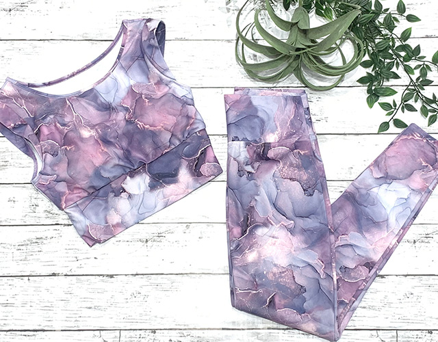 ヨガやジムなどのアクティブシーンや水着としても使える水陸両用ウェア。大理石のようなダイナミックなマーブルプリントデザインが印象的。パープルカラーが上品で華やかに見せてくれます。