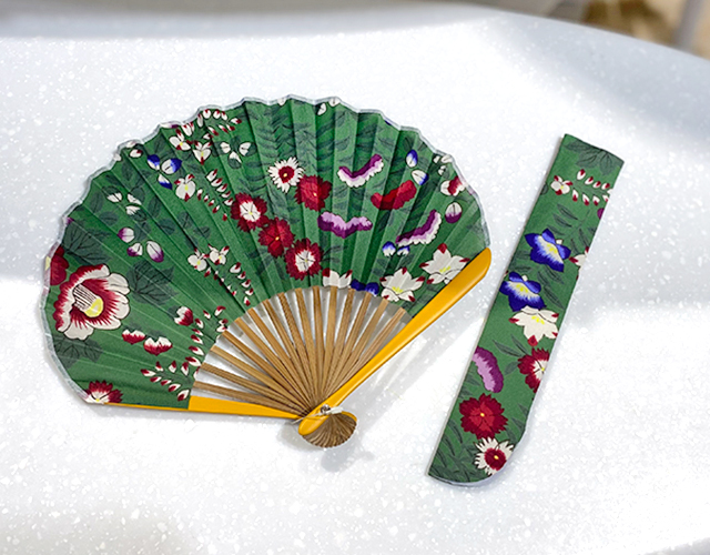 ふりふオリジナルテキスタイル「ハトの庭」の生地を使用した扇子は日常使いしやすいほたて型のコロンとしたフォルムが可愛いアイテム。同生地の袋つきなのでバッグの中で広がらず、扇子を傷めることなく 長くお使いいただけます。年代を問わずギフトにもおすすめです。
