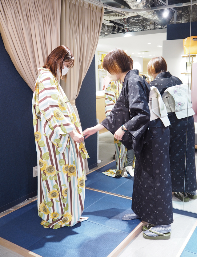 「きもの やまと」では1回1,000円にて着付けレッスンを行なうほか、浴衣の有料着付けも3,300円にて承っています。(どちらも事前予約制)自分ひとりだと着付けに自信がない方はぜひ利用してみてくださいね。