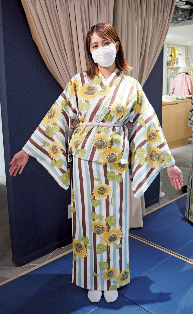 ひまわりを大胆にあしらった、「きもの やまと」のオリジナル浴衣。淡いグリーンをベースに、少しくすんだイエローで大人の可愛らしさを演出します。“弾ける・奏でる”をテーマにデザインされている通り、夏らしくて華やかさたっぷり!