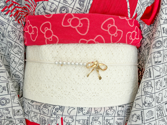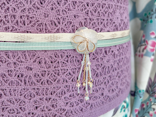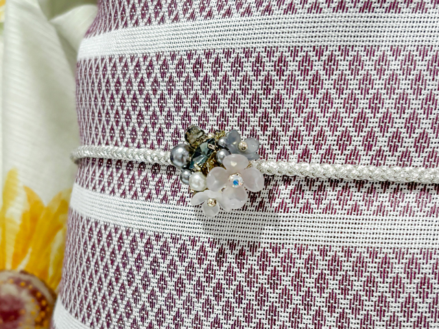 浴衣が華やかなので、帯はシックにするのが大人のバランス。パールをあしらった飾り紐をプラスすれば、ワンランク上の浴衣コーデが即完成。
