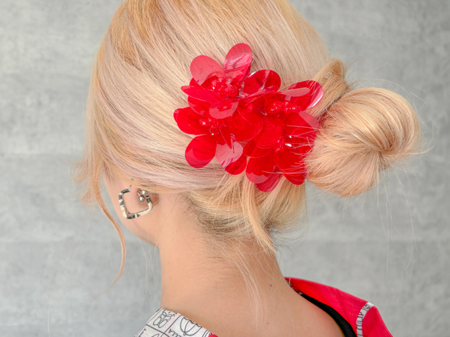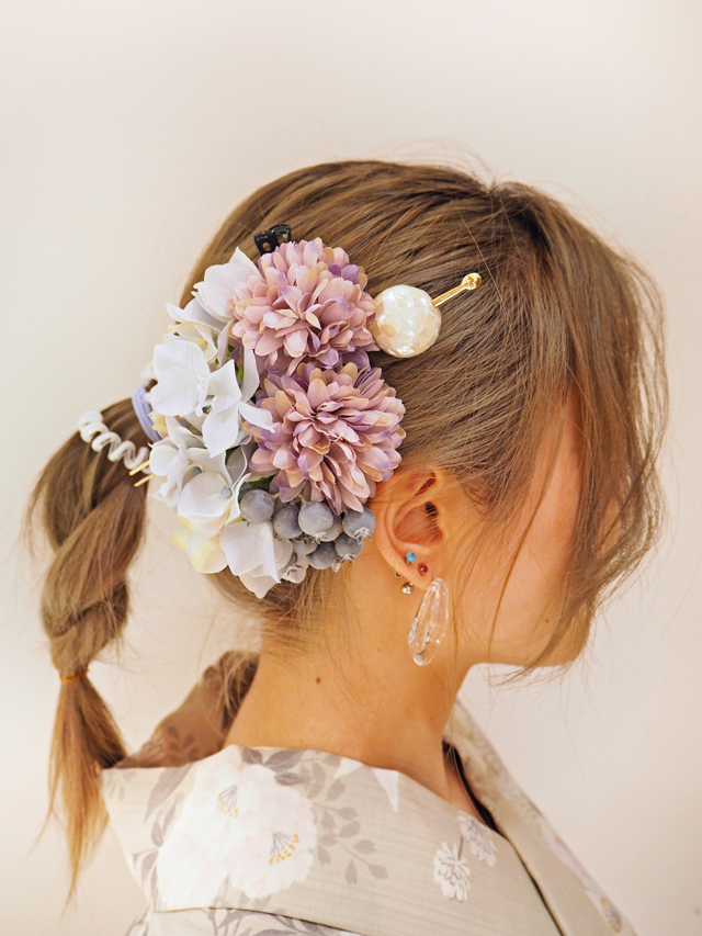 低めの位置でまとめ、真ん中あたりに大小重ねてオン♪和装はもちろん、結婚式やパーティなど華やかなシーンにも使えます。
